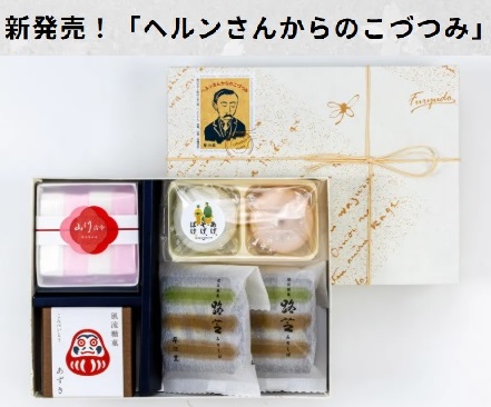 🎁ヘルンさん直筆のイラストとアルファベットで書かれた狂歌をあしらったデザインの箱に銘菓をお詰合せ。🎁 ❖先代が小泉八雲の作品に親しみ、長年にわたり山陰アイルランド協会の会長を務めるなど様々なご縁をいただいております。 箱デザインは、小泉八雲直筆のイラストとアルファベットで書かれた狂歌をあしらい、弊堂の代表銘菓をお詰合せしました 【詰め合せ商品内容】 1.山川古今 2.紅白朝汐 2ヶ 3.路芝(3本入) 2ヶ 4.風流糖菓 あずき 1ヶ